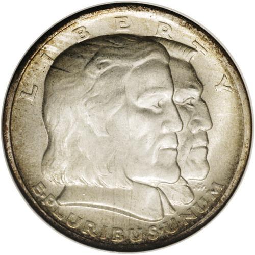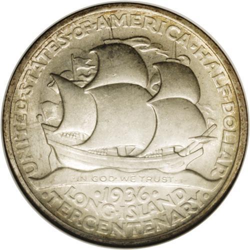 <B>1936<50C> Long Island MS67 NGC.</B></I> The Long Island half dollar was struck to commemorate the establishment of the first white settlement on the island at Jamaica Bay. The present coin is an impeccable example with soft frosty surfaces and light ivory color. Both sides are accented by peripheral gold toning, which is more prominent on the obverse. A sharp impression is apparent on the design elements, and a couple of tiny marks on the portrait of the Dutch settler and on the mainsails do not detract from the coin's overall eye appeal. Census: 36 in 67, 2 finer (5/06).