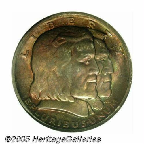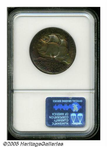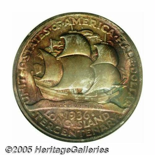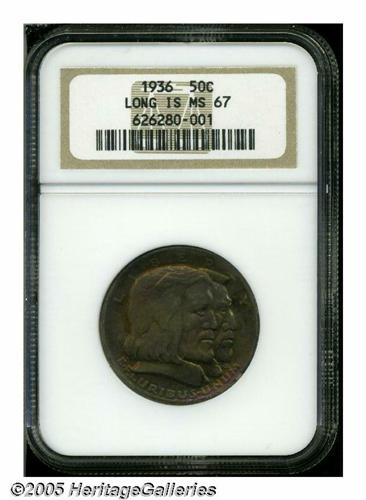 <B>1936<50C> Long Island MS67 NGC.</B></I> Uncommonly lustrous and colorful, this coin's coloration grabs the immediate attention of the viewer. Both sides are crimson and gray with an occasional dab of lime-green and original brilliance. Sure to excite the toning enthusiasts among commemorative collectors. Population: 32 in 67, 2 finer (5/05).<BR><I>From The Western Hills Collection.</B></I>