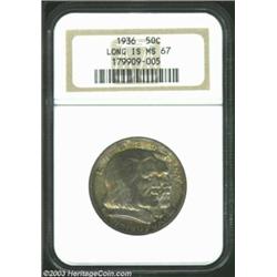<table><tr><td><TABLE cellSpacing=0 cellPadding=0 width="100%" bgColor=#000000 border=0><TBODY> <TR><TD width="100%"><TABLE cellSpacing=1 cellPadding=3 width="100%" border=0><TBODY><TR><TD width="100%" bgColor=#79735c><FONT face=arial color=#ffffff size=3><B>Description</B> </FONT></TD></TR><TR><TD width="100%" bgColor=#ffffff><FONT face=arial size=2><B>1936 50C Long Island MS67 NGC.</B></I> Far more attractive than the typically encountered Long Island, the smooth surfaces display vibrant mint frost and pinpoint striking detail. A rich endowment of tan-gray and lavender toning overlays all with tinges of rainbow color toward the upper obverse and lower reverse rims. Population: 23 in 67, 2 finer (7/03). </FONT></TD></TR></TBODY></TABLE></TD></TR></TBODY></TABLE><BR><A name=PricesRealized></A><TABLE cellSpacing=0 cellPadding=0 width="100%" bgColor=#000000 border=0><TBODY><TR><TD width="100%"><TABLE cellSpacing=1 cellPadding=3 width="100%" border=0><TBODY><TR><TD width="100%" bgColor=#79735c><A name=PR><FONT face=arial color=#ffffff size=3><B>Previous Prices from Heritage Auctions</B> </FONT></A></TD></TR><TR><TD bgColor=#f6f6ed><TABLE cellSpacing=0 cellPadding=0 width="100%" border=1><TBODY><TR><TD align=middle width="33%"><B>Date</B></TD><TD align=middle width="33%"><B>Service</B></TD><TD align=middle width="33%"><B>Price</B></TD></TR><TR bgColor=whitesmoke><TD width="33%"><B>09/20/2003</B></TD><TD width="33%">PCGS</TD><TD width="33%">$18,400.00</TD></TR><TR bgColor=whitesmoke><TD width="33%"><B>05/31/2003</B></TD><TD width="33%">PCGS</TD><TD width="33%">$2,012.50</TD></TR><TR bgColor=whitesmoke><TD width="33%"><B>11/23/2002</B></TD><TD width="33%">PCGS</TD><TD width="33%">$6,210.00</TD></TR><TR bgColor=whitesmoke><TD width="33%"><B>01/12/2002</B></TD><TD width="33%">PCGS</TD><TD width="33%">$14,375.00</TD></TR><TR bgColor=whitesmoke><TD width="33%"><B>04/07/2001</B></TD><TD width="33%">NGC</TD><TD width="33%">$1,725.00</TD></TR><TR bgColor=whitesmoke><TD width="33%"><B>10/06/2000</B></TD><TD width="33%">NGC</TD><TD width="33%">$1,610.00</TD></TR><TR bgColor=whitesmoke><TD width="33%"><B>09/25/1999</B></TD><TD width="33%">NGC</TD><TD width="33%">$2,875.00</TD></TR><TR bgColor=whitesmoke><TD width="33%"><B>06/04/1999</B></TD><TD width="33%">NGC</TD><TD width="33%">$2,645.00</TD></TR><TR bgColor=whitesmoke><TD width="33%"><B>06/06/1998</B></TD><TD width="33%">NGC</TD><TD width="33%">$6,440.00</TD></TR><TR bgColor=whitesmoke><TD width="33%"><B>01/06/1996</B></TD><TD width="33%">PCGS</TD><TD width="33%">$5,775.00</TD></TR><TR bgColor=whitesmoke><TD width="33%"><B>03/12/1993</B></TD><TD width="33%">ANACS</TD><TD width="33%">$1,760.00</TD></TR></TBODY></TABLE></TD></TR><TR><TD bgColor=#ffffff><FONT face=arial size=1 ?>PLEASE NOTE: All prices realized reflect the final hammer price PLUS the buyer's premium in auctions that charge a buyer's premium. Each item has a notation at the top of the listing indicating whether that lot included a buyer's premium. Example: A item that sells with a final hammer price of $100 and a 20% buyer's premium will display with a price realized of $120. All information listed is intended to be as accurate as possible, but errors are possible. Please use this guide carefully and inform us of any inaccuracies. </FONT></TD></TR></TBODY></TABLE></TD></TR></TBODY></TABLE><BR><TABLE cellSpacing=0 cellPadding=0 width="100%" bgColor=#000000 border=0><TBODY><TR><TD width="100%"><TABLE cellSpacing=1 cellPadding=3 width="100%" border=0><TBODY><TR><TD width="100%" bgColor=#79735c colSpan=6><FONT face=arial color=#ffffff size=3><B>Price Guide*</B> </FONT></TD></TR><TR bgColor=#f6f6ed><TD align=middle><B>Grade</B> </TD><TD align=middle><B>Coin World<BR>(Trends)</B> </TD><TD align=middle><B>Numismedia<BR>Retail</B> </TD><TD align=middle><B>Numismedia<BR>Wholesale</B> </TD><TD align=middle><B>Coin<BR>Universe</B> </TD><TD align=middle><B>Heritage<BR>Value Index</B> </TD></TR><TR bgColor=#ffffff><TD align=middle>66</TD><TD align=right>$1,300.00</TD><TD align=right>---</TD><TD align=right>$875.00</TD><TD align=right>$1,350.00</TD><TD align=right>$821.88</TD></TR><TR style="FONT-WEIGHT: bold" bgColor=#cccfdd><TD align=middle>67</TD><TD align=right>$5,000.00</TD><TD align=right>---</TD><TD align=right>$2,650.00</TD><TD align=right>$6,500.00</TD><TD align=right>$8,816.67</TD></TR><TR bgColor=#ffffff><TD align=middle>68</TD><TD align=right>---</TD><TD align=right>---</TD><TD align=right>$10,500.00</TD><TD align=right>---</TD><TD align=right>---</TD></TR><TR bgColor=#ffffff><TD colSpan=6><FONT size=1>*All information listed is intended to be as accurate as possible, but errors are possible. No item may be returned or refused based on this information which is provided as a service to our customers. You should contact each pricing source directly to determine the accuracy of this information. </FONT></TD></TR></TBODY></TABLE></TD></TR></TBODY></TABLE><BR><TABLE cellSpacing=0 cellPadding=0 width="100%" bgColor=#000000 border=0><TBODY><TR><TD width="100%"><TABLE cellSpacing=1 cellPadding=3 width="100%" border=0><TBODY><TR><TD width="100%" bgColor=#79735c><FONT face=arial color=#ffffff size=3><B>Population Guide</B> </FONT></TD></TR><TR bgColor=#ffffff><TD align=middle><!-- Begin Output of Population Grid--><TABLE cellSpacing=0 cellPadding=0 width="100%" border=0><TBODY><TR><TD vAlign=center><TABLE cellSpacing=0 width="100%" border=1 cellsadding="3"><TBODY><TR><TD vAlign=center><TABLE cellSpacing=0 cellPadding=3 width="100%" border=1><TBODY><TR><TD vAlign=center align=middle bgColor=#f0f1e8 colSpan=2 <CENTER><FONT face=Arial size=2><B>PCGS Pop </B></FONT><CENTER></CENTER></TD><TD vAlign=center align=middle bgColor=#f0f1e8 colSpan=2><CENTER><FONT face=Arial size=2><B>NGC Pop</B></CENTER></FONT></TD></TR><TR><TD vAlign=center><FONT face=Arial size=2>(67)</FONT> </TD><TD vAlign=center align=right><FONT face=Arial size=2>17</FONT> </TD><TD vAlign=center><FONT face=Arial size=2>(67)</FONT> </TD><