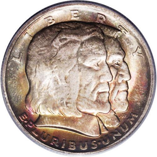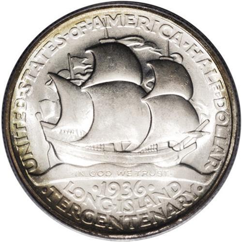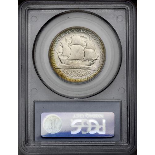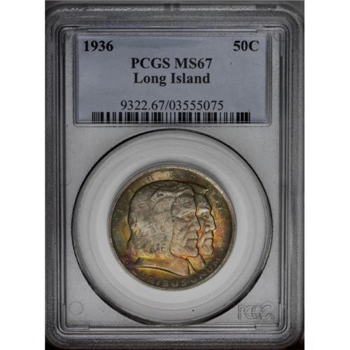 <B>1936<50C> Long Island MS67 PCGS.</B></I> The obverse displays a wonderful array of yellow-gold, crimson, mauve, sky-blue, and lavender toning, while the reverse exhibits just a whisper of golden-green that hugs the rim area. The design elements are exceptionally well brought up. Perhaps the most outstanding feature of this coin is the refreshingly silk-like smoothness of the radiantly lustrous surfaces. Just a few minor luster grazes and tiny contact marks are seen on a couple of the reverse sails. Population: 23 in 67, 0 finer (3/06). <BR><BR><B>Important notice:</B> Heritage usually auctions material at the rate of 200-250 lots per hour. On some occasions eBay Live bid software or the Internet may not be able to keep up with the pace of the auction. We recommend placing a realistic absentee bid now as insurance to avoid disappointment. Occasionally the auctioneer may eliminate or reject an eBay Live bid, and the auctioneer may also reopen a lot after the close of the eBay live bidding (usually because we missed an audience bid), and may reject your bid even if it shows you as the winning bidder. By bidding via eBay Live, you agree that Heritage may award the lot to another bidder at its sole discretion under the circumstances described above or any other reasonable circumstances. Since eBay bids are not shown to us until we open the lot on the floor, we treat those bids just like floor bids. In most cases the floor responds before the eBay bid is presented to us, due to Internet lag time, so for consistency we have made it a policy that floor bids are always considered first over tie eBay live bids. Also please note that all Heritage lots purchased through eBay Live carry a 20% Buyer's Premium. Please make sure you read the Terms and Conditions before you bid. This lot is being auctioned in conjunction with a live floor auction by Heritage Galleries & Auctioneers. All final auction and invoice information will be supplied by Heritage Galleries & Auctioneers, and all other information should be considered preliminary. Lot:4989 <BR><BR><B>Winning Notification and Billing:</B> After the FINAL session in this auction is complete, Heritage will send e-mail and snail mail invoices. This process normally takes several days. All final auction and invoice information will be supplied by Heritage Galleries & Auctioneers, and all other information should be considered preliminary. <BR><BR>This auction will be conducted on a live auction floor and over the Internet through eBay Live. If you choose to place an absentee bid, please take a moment to <font color='#0000ff'><u><a href='http://pages.ebay.com/liveauctions/help/before/laabsentee.html'>learn how eBay Live absentee bidding works</a></u></font><font color='#000000'>