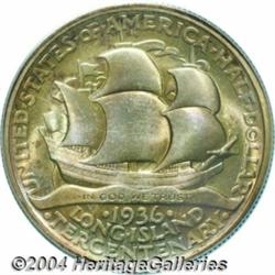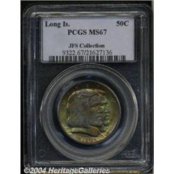 <B>1936<50C> Long Island MS67 PCGS.</B></I> Exuberantly toned in rather wild, uneven hues, with lime-green and purple-red being the most noteworthy. Typically well struck, expertly preserved, and highly lustrous as well. None have been graded any finer, by PCGS. Population: 18 in 67, 0 finer (3/04).<BR><I>Ex: FUN Signature Sale (Heritage, 1/02), lot 8783, which realized $14,375.</B></I><BR><I>From the JFS Collection, the #1 All-Time PCGS Registry Set.</B></I> <BR><BR><B>Important notice:</B> Heritage usually auctions material at the rate of 200-250 lots per hour. On some occasions eBay Live bid software or the Internet may not be able to keep up with the pace of the auction. We recommend placing a realistic absentee bid now as insurance to avoid disappointment. Occasionally the auctioneer may eliminate or reject an eBay Live bid, and the auctioneer may also reopen a lot after the close of the eBay live bidding (usually because we missed an audience bid), and may reject your bid even if it shows you as the winning bidder. By bidding via eBay Live, you agree that Heritage may award the lot to another bidder at its sole discretion under the circumstances described above or any other reasonable circumstances. Since eBay bids are not shown to us until we open the lot on the floor, we treat those bids just like floor bids. In most cases the floor responds before the eBay bid is presented to us, due to Internet lag time, so for consistency we have made it a policy that floor bids are always considered first over tie eBay live bids. Also please note that all Heritage lots purchased through eBay Live carry a 20% Buyer's Premium. Please make sure you read the Terms and Conditions before you bid. </span></font></tr></table></td></tr></table>