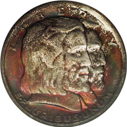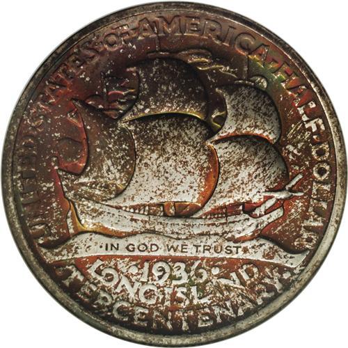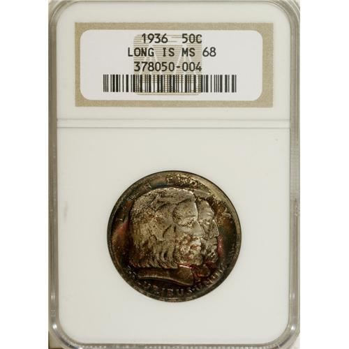 <B>1936 50C Long Island MS68 NGC.</B></I> In the realm of 1930s commemoratives, the Long Island was an anomalous issue. It consisted of one design from a single mint; Philadelphia struck 100,053 pieces, the full amount authorized plus assay coins; the price was just $1, a far cry from the $1.50 and above that had become standard fare; and less than 20% of the original mintage was melted, which made the entire promotion unusually successful.<BR> The captivating survivor offered here is one of the best-preserved and most distinctive examples available. Magenta, cherry, and orange patina with violet accents graces parts of both sides, while the central devices are largely silver-gray. The seemingly flawless surfaces exhibit pleasing, satiny luster. NGC has awarded an MS68 grade to only two pieces, while no such coins appear in the PCGS <I>Population Report</B></I> (4/07).<BR><I>From The Cary & Cheryl Porter Collection.</B></I><BR><BR><b>Shipping:</b> Coins & Currency (<a target="_blank" href="http://www.heritageauctions.com/common/shipping.php">view shipping information</a>)