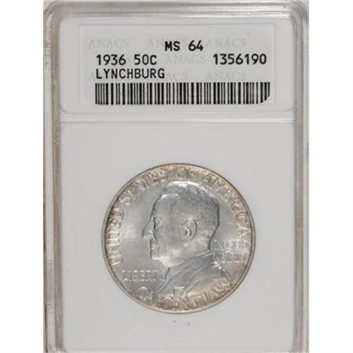 <B>1936 50C Lynchburg MS64 ANACS.</B></I> NGC Census: (632/1388). PCGS Population (1205/1789). Mintage: 20,013. Numismedia Wsl. Price for NGC/PCGS coin in MS64: $258. (#9324)<BR><BR><b>Shipping:</b> Coins & Currency (<a target="_blank" href="http://www.heritageauctions.com/common/shipping.php">view shipping information</a>)