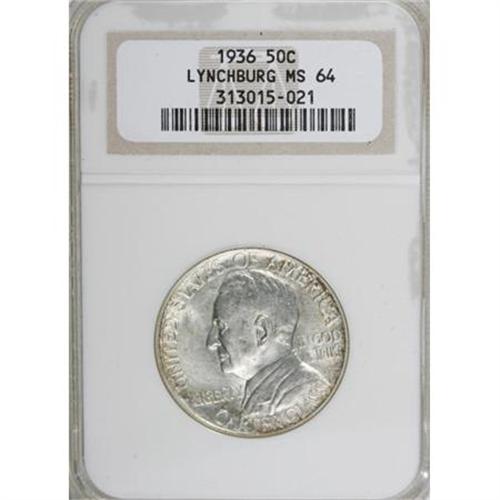 <B>1936 50C Lynchburg MS64 NGC.</B></I> NGC Census: (626/1384). PCGS Population (1201/1783). Mintage: 20,013. Numismedia Wsl. Price for NGC/PCGS coin in MS64: $258. (#9324)<BR><BR><b>Shipping:</b> Coins & Currency (<a target="_blank" href="http://www.heritageauctions.com/common/shipping.php">view shipping information</a>)