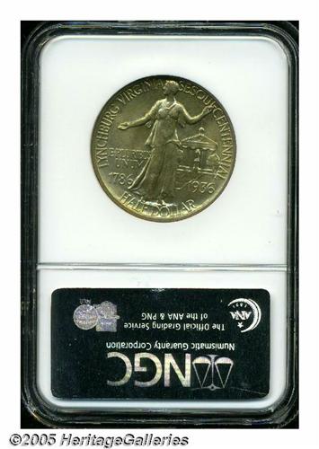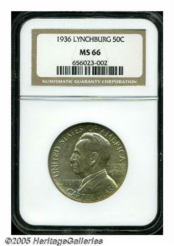 <B>1936<50C> Lynchburg MS66 NGC.</B></I> Delicate lime-gold and reddish toning with an above average strike. Close examination reveals a milling mark on Liberty's leg on the reverse.