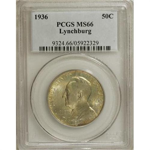 <B>1936 50C Lynchburg MS66 PCGS.</B></I> Quite frosty with liberal splashes of golden toning on the obverse. Lighter pinkish-gold hues cling to the reverse border.<BR><BR><b>Shipping:</b> Coins & Currency (<a target="_blank" href="http://www.heritageauctions.com/common/shipping.php">view shipping information</a>\)