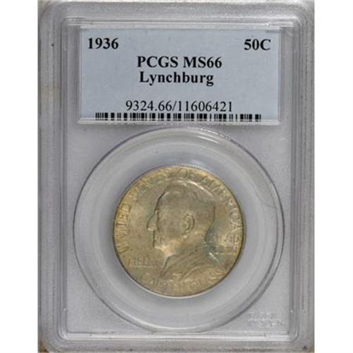 <B>1936 50C Lynchburg MS66 PCGS.</B></I> PCGS Population (526/54). NGC Census: (381/91). Mintage: 20,013. Numismedia Wsl. Price for NGC/PCGS coin in MS66: $492. (#9324)<BR><BR><b>Shipping:</b> Coins & Currency (<a target="_blank" href="http://www.heritageauctions.com/common/shipping.php">view shipping information</a>)