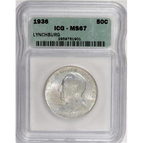 <B>1936 50C Lynchburg MS67 ICG.</B></I> NGC Census: (86/5). PCGS Population (54/0). Mintage: 20,013. Numismedia Wsl. Price for NGC/PCGS coin in MS67: $1,850. (#9324)<BR><BR><b>Shipping:</b> Coins & Currency (<a target="_blank" href="http://www.heritageauctions.com/common/shipping.php">view shipping information</a>)