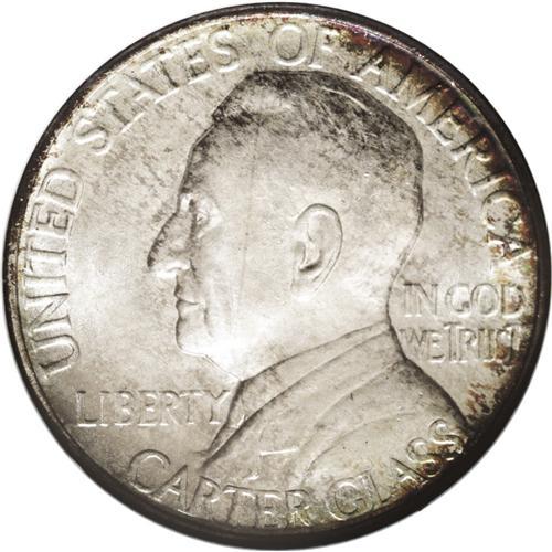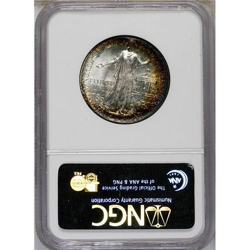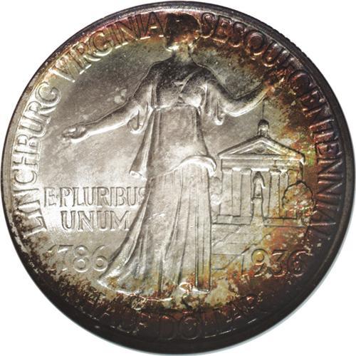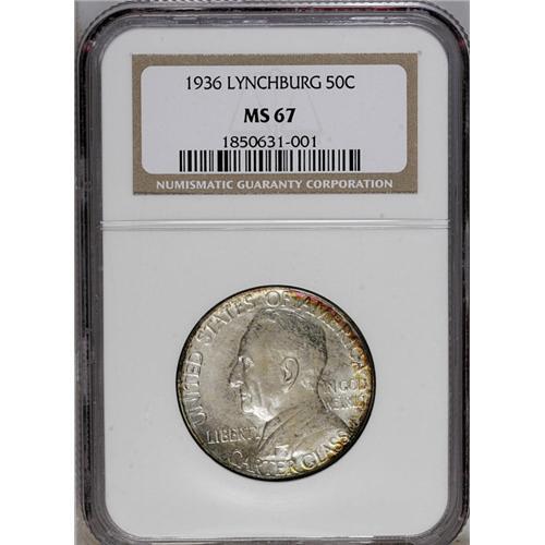 <B>1936<50C> Lynchburg MS67 NGC.</B></I> Very deep multicolored iridescence has gathered at the peripheries of this otherwise soft gray example. The surfaces have been carefully preserved and exhibit only a few tiny marks under magnification. Well detailed throughout. Census: 70 in 67, 4 finer (7/06).