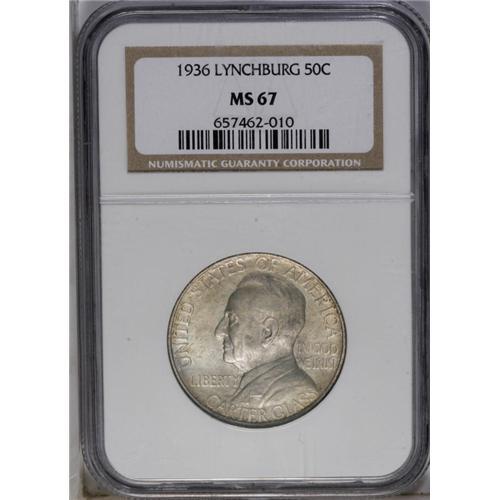<B>1936<50C> Lynchburg MS67 NGC.</B></I> Well defined with a layer of creamy, light-colored patina over both sides and satiny surfaces that are near-pristine. An attractive and conditionally scarce Superb Gem. Census: 67 in 67, 4 finer (5/06).