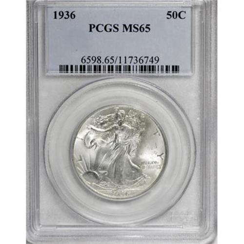 <B>1936 50C MS65 PCGS.</B></I> PCGS Population (1660/798). NGC Census: (977/559). Mintage: 12,617,901. Numismedia Wsl. Price for NGC/PCGS coin in MS65: $270. (#6598)<BR><BR><B>Coin Engraver:</B> Adolph A. Weinman<BR><BR><b>Shipping:</b> Coins & Currency (<a target="_blank" href="http://www.heritageauctions.com/common/shipping.php">view shipping information</a>)