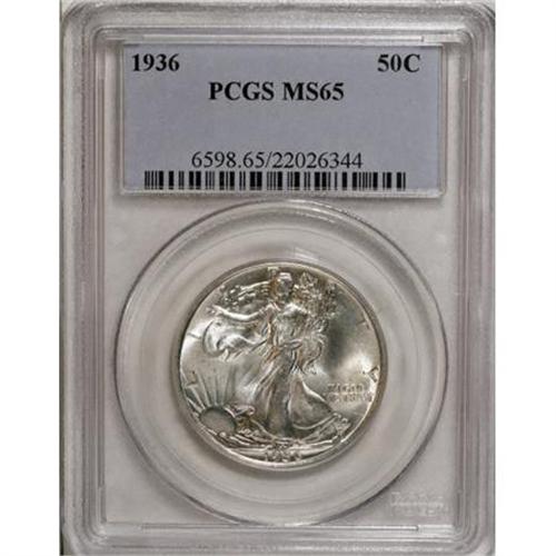 <B>1936 50C MS65 PCGS.</B></I> . PCGS Population (1666/798). NGC Census: (980/564). Mintage: 12,617,901. Numismedia Wsl. Price for NGC/PCGS coin in MS65: $240. (#6598)<BR><BR><B>Coin Engraver:</B> Adolph A. Weinman<BR><BR><b>Shipping:</b> Coins & Currency (<a target="_blank" href="http://www.heritageauctions.com/common/shipping.php">view shipping information</a>)