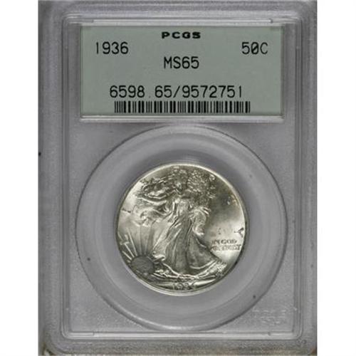 <B>1936 50C MS65 PCGS.</B></I> PCGS Population (1670/808). NGC Census: (982/563). Mintage: 12,617,901. Numismedia Wsl. Price for NGC/PCGS coin in MS65: $220. (#6598)<BR><BR><B>Coin Engraver:</B> Adolph A. Weinman<BR><BR><b>Shipping:</b> Coins & Currency (<a target="_blank" href="http://www.heritageauctions.com/common/shipping.php">view shipping information</a>)