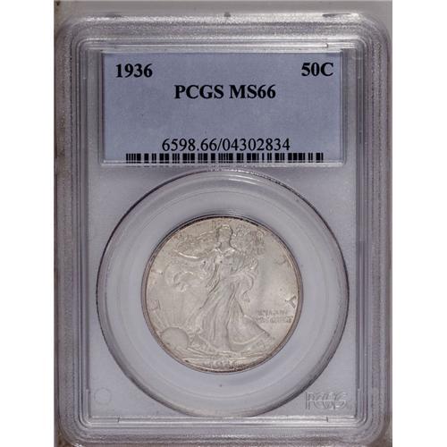 <B>1936<50C> MS66 PCGS.</B></I> The ivory-colored surfaces reveal striking details that are less than full, but certainly adequate, on obverse and reverse alike. Typical satin luster highlights the smooth, virtually unmarked fields and devices. A pleasing Premium Gem example.