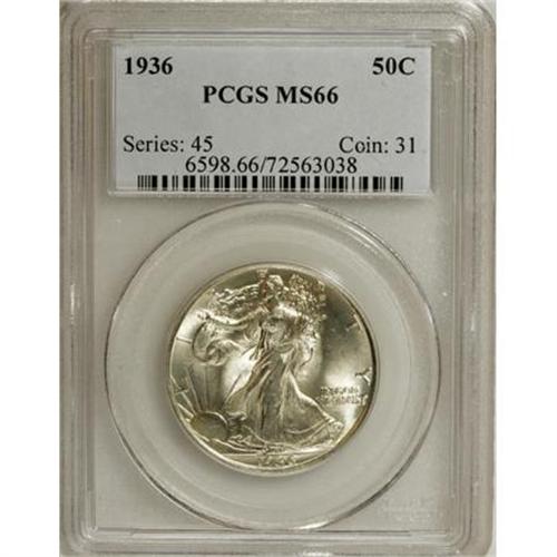 <B>1936 50C MS66 PCGS.</B></I> PCGS Population (690/102). NGC Census: (463/78). Mintage: 12,617,901. Numismedia Wsl. Price for NGC/PCGS coin in MS66: $525. (#6598)<BR><BR><B>Coin Engraver:</B> Adolph A. Weinman<BR><BR><b>Shipping:</b> Coins & Currency (<a target="_blank" href="http://www.heritageauctions.com/common/shipping.php">view shipping information</a>)