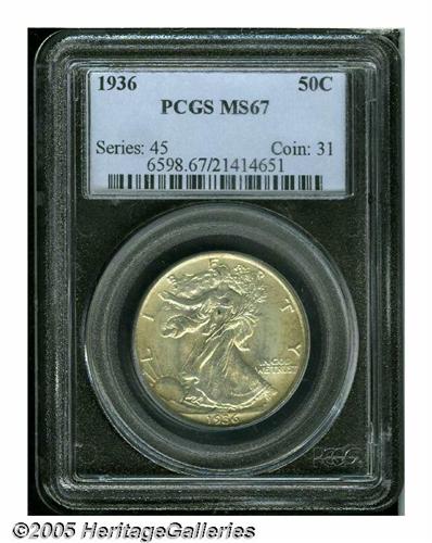 <B>1936<50C> MS67 PCGS.</B></I> Lustrous surfaces are covered by milky-gold toning, and display sharply struck devices, including strong definition on Liberty's head, gown lines, and left hand area. The surfaces are well preserved, showing no significant marks. Population: 93 in 67, 2 finer (5/05).