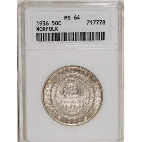 <B>1936 50C Norfolk MS64 ANACS.</B></I> NGC Census: (170/2139). PCGS Population (597/3518). Mintage: 16,936. Numismedia Wsl. Price for NGC/PCGS coin in MS64: $465. (#9337)<BR><BR><b>Shipping:</b> Coins & Currency (<a target="_blank" href="http://www.heritageauctions.com/common/shipping.php">view shipping information</a>)