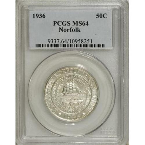 <B>1936 50C Norfolk MS64 PCGS.</B></I> PCGS Population (594/3501). NGC Census: (170/2122). Mintage: 16,936. Numismedia Wsl. Price for NGC/PCGS coin in MS64: $480. (#9337)<BR><BR><b>Shipping:</b> Coins & Currency (<a target="_blank" href="http://www.heritageauctions.com/common/shipping.php">view shipping information</a>)