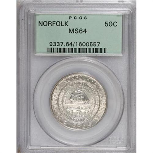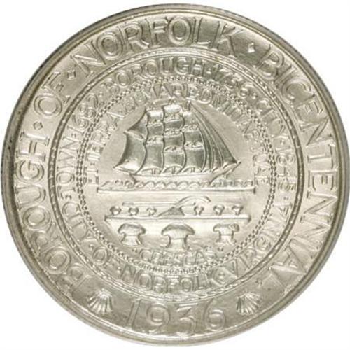 <B>1936 50C Norfolk MS64 PCGS.</B></I> PCGS Population (595/3498). NGC Census: (170/2132). Mintage: 16,936. Numismedia Wsl. Price for NGC/PCGS coin in MS64: $480. (#9337)<BR><BR><b>Shipping:</b> Coins & Currency (<a target="_blank" href="http://www.heritageauctions.com/common/shipping.php">view shipping information</a>)