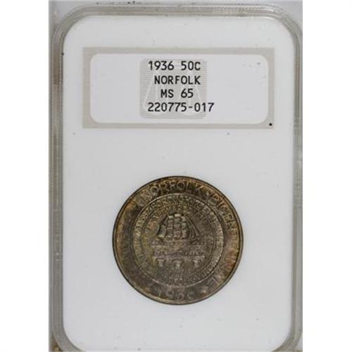 <B>1936 50C Norfolk MS65 NGC.</B></I> NGC Census: (518/1614). PCGS Population (1052/2446). Mintage: 16,936. Numismedia Wsl. Price for NGC/PCGS coin in MS65: $535. (#9337)<BR><BR><b>Shipping:</b> Coins & Currency (<a target="_blank" href="http://www.heritageauctions.com/common/shipping.php">view shipping information</a>)