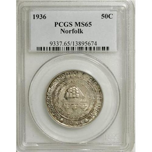 <B>1936 50C Norfolk MS65 PCGS.</B></I> PCGS Population (1050/2426). NGC Census: (512/1589). Mintage: 16,936. Numismedia Wsl. Price for NGC/PCGS coin in MS65: $535. (#9337)<BR><I>From The Frank DuVall Collection of U.S. Commemoratives.</B></I><BR><BR><b>Shipping:</b> Coins & Currency (<a target="_blank" href="http://www.heritageauctions.com/common/shipping.php">view shipping information</a>\)