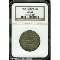 1936 50C Norfolk MS66 NGC. Sharply struck and pris <B>1936 50C Norfolk MS66 NGC.</B></I> Sharply struck and pristine, with a deep full coating of forest-green patina over both sides, and pleasing intermittent golden accents. An unusually highly attractive example of this popular commemorative issue. <BR><BR><B>Important notice:</B> Heritage usually auctions material at the rate of 200-250 lots per hour. On some occasions eBay Live bid software or the Internet may not be able to keep up with the pace of the auction. We recommend placing a realistic absentee bid now as insurance to avoid disappointment. Occasionally the auctioneer may eliminate or reject an eBay Live bid, and the auctioneer may also reopen a lot after the close of the eBay live bidding (usually because we missed an audience bid), and may reject your bid even if it shows you as the winning bidder. By bidding via eBay Live, you agree that Heritage may award the lot to another bidder at its sole discretion under the circumstances described above or any other reasonable circumstances. Since eBay bids are not shown to us until we open the lot on the floor, we treat those bids just like floor bids. In most cases the floor responds before the eBay bid is presented to us, due to Internet lag time, so for consistency we have made it a policy that floor bids are always considered first over tie eBay live bids. Also please note that all Heritage lots purchased through eBay Live carry a 20% Buyer's Premium. Please make sure you read the Terms and Conditions before you bid. This lot is being auctioned in conjunction with a live floor auction by Heritage Galleries & Auctioneers. All final auction and invoice information will be supplied by Heritage Galleries & Auctioneers, and all other information should be considered preliminary. Lot:7919