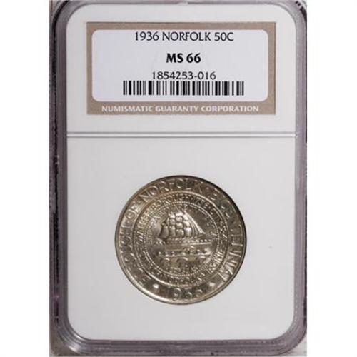 <B>1936 50C Norfolk MS66 NGC.</B></I> NGC Census: (965/624). PCGS Population (1441/985). Mintage: 16,936. Numismedia Wsl. Price for NGC/PCGS coin in MS66: $585. (#9337)<BR><I>From The Frank DuVall Collection of U.S. Commemoratives.</B></I><BR><BR><b>Shipping:</b> Coins & Currency (<a target="_blank" href="http://www.heritageauctions.com/common/shipping.php">view shipping information</a>\)