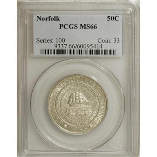 <B>1936 50C Norfolk MS66 PCGS.</B></I> PCGS Population (1449/984). NGC Census: (966/630). Mintage: 16,936. Numismedia Wsl. Price for NGC/PCGS coin in MS66: $585. (#9337)<BR><BR><b>Shipping:</b> Coins & Currency (<a target="_blank" href="http://www.heritageauctions.com/common/shipping.php">view shipping information</a>)