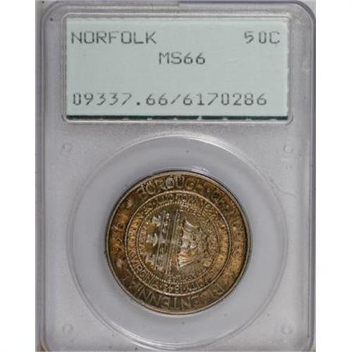 <B>1936 50C Norfolk MS66 PCGS.</B></I> PCGS Population (1457/989). NGC Census: (969/635). Mintage: 16,936. Numismedia Wsl. Price for NGC/PCGS coin in MS66: $585. (#9337)<BR><BR><b>Shipping:</b> Coins & Currency (<a target="_blank" href="http://www.heritageauctions.com/common/shipping.php">view shipping information</a>)