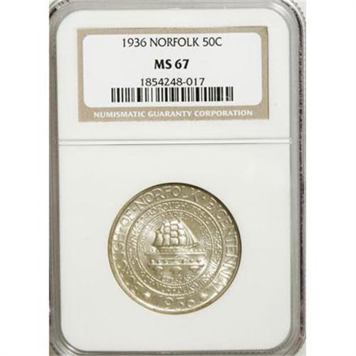 <B>1936 50C Norfolk MS67 NGC.</B></I> NGC Census: (567/57). PCGS Population (846/139). Mintage: 16,936. Numismedia Wsl. Price for NGC/PCGS coin in MS67: $675. (#9337)<BR><I>From The Frank DuVall Collection of U.S. Commemoratives.</B></I><BR><BR><b>Shipping:</b> Coins & Currency (<a target="_blank" href="http://www.heritageauctions.com/common/shipping.php">view shipping information</a>\)