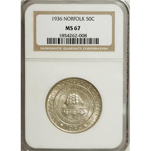 <B>1936 50C Norfolk MS67 NGC.</B></I> Accompanying the lot are three original five-slot Norfolk coin holders and an order form for the Norfolk half dollar. NGC Census: (567/57). PCGS Population (846/139). Mintage: 16,936. Numismedia Wsl. Price for NGC/PCGS coin in MS67: $675. (#9337)<BR><I>From The Frank DuVall Collection of U.S. Commemoratives.</B></I><BR><BR><b>Shipping:</b> Coins & Currency (<a target="_blank" href="http://www.heritageauctions.com/common/shipping.php">view shipping information</a>\)