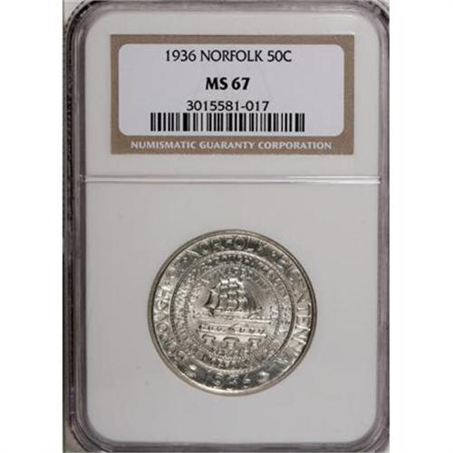 <B>1936 50C Norfolk MS67 NGC.</B></I> Essentially untoned save for a whisper of silver-blue at the margins. This crisply struck and characteristically well-preserved Norfolk piece offers solid eye appeal.<BR><BR><b>Shipping:</b> Coins & Currency (<a target="_blank" href="http://www.heritageauctions.com/common/shipping.php">view shipping information</a>)