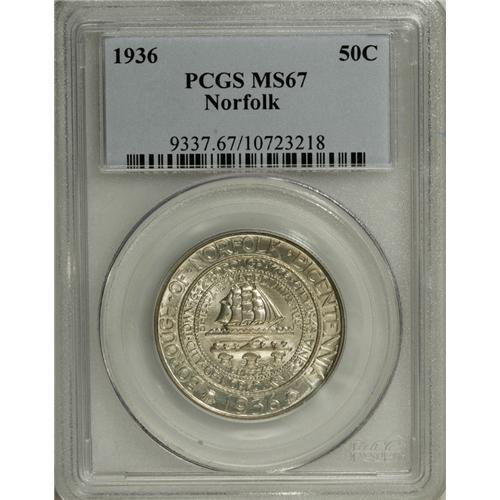 1936 50C Norfolk MS67 PCGS. Highly lustrous with thin