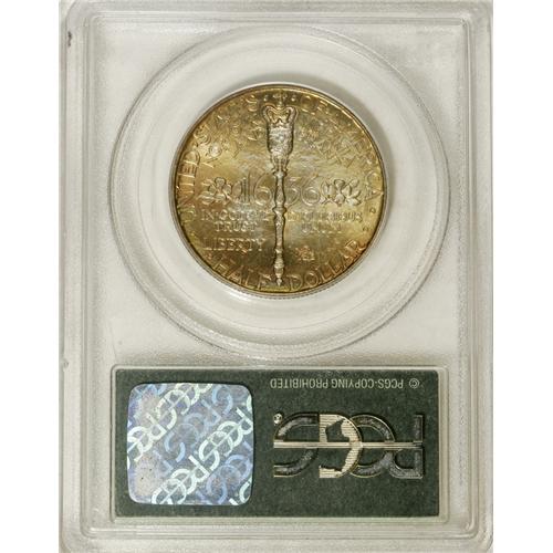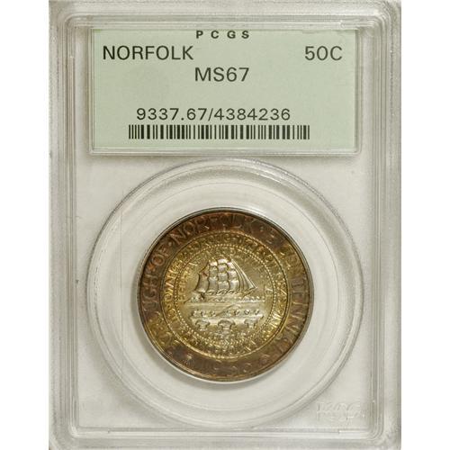 <B>1936 50C Norfolk MS67 PCGS.</B></I> The obverse of this elegant commemorative exhibits this issue's famous tab toning, with salmon-plum outer bands, golden patina at the tabs and the inner circles, and silver-gray at the ship. On the reverse, greenish-gold outer bands blend with subtle steel-gray elements.<BR><I>From The Cary & Cheryl Porter Collection.</B></I><BR><BR><b>Shipping:</b> Coins & Currency (<a target="_blank" href="http://www.heritageauctions.com/common/shipping.php">view shipping information</a>)