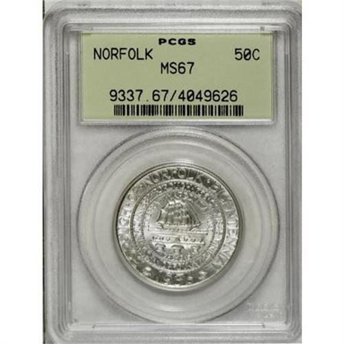 <B>1936 50C Norfolk MS67 PCGS.</B></I> PCGS Population (847/139). NGC Census: (573/57). Mintage: 16,936. Numismedia Wsl. Price for NGC/PCGS coin in MS67: $675. (#9337)<BR><BR><b>Shipping:</b> Coins & Currency (<a target="_blank" href="http://www.heritageauctions.com/common/shipping.php">view shipping information</a>\)