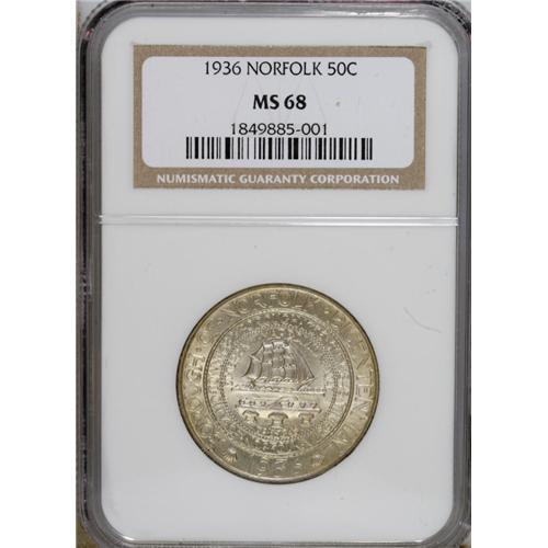 <B>1936 50C Norfolk MS68 NGC.</B></I> Lustrous surfaces are lightly toned on the obverse, but assume a deeper mottling of multicolored patination on the reverse. Sharply struck and lovingly preserved. Census: 57 in 68, 0 finer (2/07).<BR><BR><b>Shipping:</b> Coins & Currency (<a target="_blank" href="http://www.heritageauctions.com/common/shipping.php">view shipping information</a>)