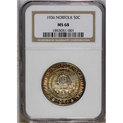 <B>1936 50C Norfolk MS68 NGC.</B></I> Lustrous with rich orange and bronze patina over each side, with the exception of silver-gray in the center of the reverse. A practically piece, tied for the finest certified by either NGC or PCGS (10/06).<BR><BR><b>Shipping:</b> Coin/Currency (<a target="_blank" href="http://www.heritageauctions.com/common/shipping.php">view shipping information</a>)