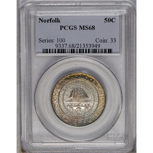 <B>1936<50C> Norfolk MS68 PCGS.</B></I> This is a gorgeous Superb MS68 example and it is tied for the finest certified by either PCGS or NGC. Each side has lustrous pewter-gray color at the centers, giving way to peripheral gold, rose, and champagne toning.