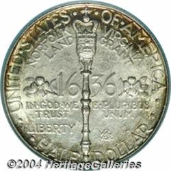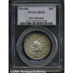 <B>1936<50C> Norfolk MS68 PCGS.</B></I> The purpose of this commemorative issue was to provide funds for the celebration of Norfolk's anniversary of its growth from a township in 1682 to a royal borough in 1736. These half dollars commemorate the 300th anniversary of the original Norfolk land grant, and the 200th anniversary of the establishment of the borough. The obverse shows the Seal of the City of Norfolk with a three-masted ship as the central device, which is well suited to this naval city. The scallop shells at the lower obverse border continue the maritime theme. The reverse central device is the Royal Mace of Norfolk, presented to the Borough of Norfolk by Lt. Governor Robert Dinwiddie in 1753. This example features gold and sea-green toning accented by violet and lavender colors. The intricate designs are well struck, and the lustrous surfaces are marvelously preserved. This beautiful specimen will provide an excellent addition to a high-end Uncirculated commemorative collection.<BR><I>From the JFS Collection, the #1 All-Time PCGS Registry Set.</B></I> <BR><BR><B>Important notice:</B> Heritage usually auctions material at the rate of 200-250 lots per hour. On some occasions eBay Live bid software or the Internet may not be able to keep up with the pace of the auction. We recommend placing a realistic absentee bid now as insurance to avoid disappointment. Occasionally the auctioneer may eliminate or reject an eBay Live bid, and the auctioneer may also reopen a lot after the close of the eBay live bidding (usually because we missed an audience bid), and may reject your bid even if it shows you as the winning bidder. By bidding via eBay Live, you agree that Heritage may award the lot to another bidder at its sole discretion under the circumstances described above or any other reasonable circumstances. Since eBay bids are not shown to us until we open the lot on the floor, we treat those bids just like floor bids. In most cases the floor responds before the eBay bid is presented to us, due to Internet lag time, so for consistency we have made it a policy that floor bids are always considered first over tie eBay live bids. Also please note that all Heritage lots purchased through eBay Live carry a 20% Buyer's Premium. Please make sure you read the Terms and Conditions before you bid. </span></font></tr></table></td></tr></table>