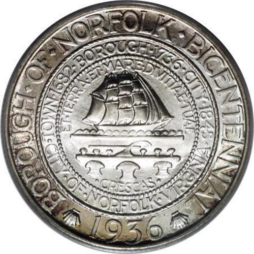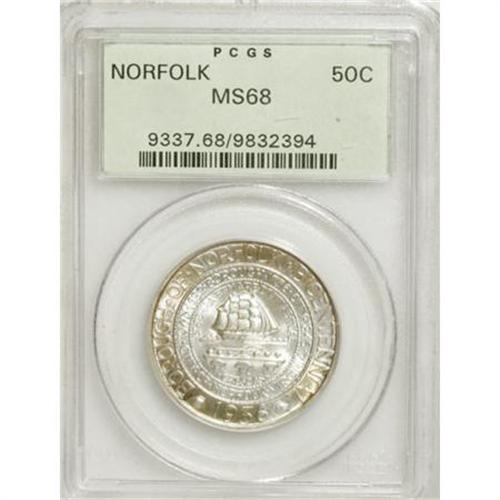 <B>1936 50C Norfolk MS68 PCGS.</B></I> One of the best-preserved survivors from an issue noted for consistently high grades, this shining commemorative shows areas of lemon-gold toning at the obverse margins, though no patina is present elsewhere on the carefully preserved surfaces. Curiously, though the Norfolk is known for exceptional quality, neither NGC nor PCGS has certified an MS69 example (9/07).<BR><I>From The Sterling Collection.</B></I><BR><BR><b>Shipping:</b> Coins & Currency (<a target="_blank" href="http://www.heritageauctions.com/common/shipping.php">view shipping information</a>)