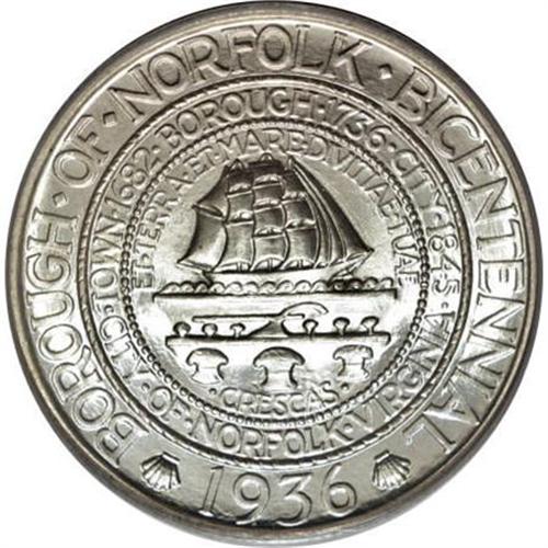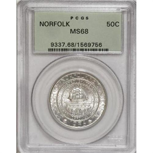 <B>1936 50C Norfolk MS68 PCGS.</B></I> Coruscating luster exudes from each side of this gorgeous Norfolk commemorative, and a penetrating strike sharpens the design features. While the well preserved surfaces appear untoned to the unaided eye, magnification reveals whispers of barely discernible powder-blue and lilac color. Housed in a green-label holder.<BR><BR><b>Shipping:</b> Coins & Currency (<a target="_blank" href="http://www.heritageauctions.com/common/shipping.php">view shipping information</a>)