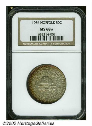 <B>1936<50C> Norfolk MS68 <S NGC.</B></I> Superlative example of this issue, with red-gold peripheries and orange surfaces. Well struck, well preserved, and possessed of very attractive surfaces. As of (6/05) neither major service has graded any examples higher.