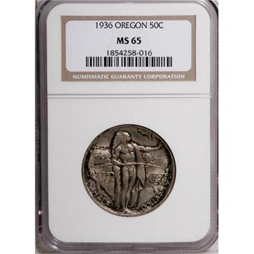 <B>1936 50C Oregon MS65 NGC.</B></I> NGC Census: (489/566). PCGS Population (768/594). Mintage: 10,006. Numismedia Wsl. Price for NGC/PCGS coin in MS65: $268. (#9345)<BR><I>From The Frank DuVall Collection of U.S. Commemoratives.</B></I><BR><BR><b>Shipping:</b> Coins & Currency (<a target="_blank" href="http://www.heritageauctions.com/common/shipping.php">view shipping information</a>\)