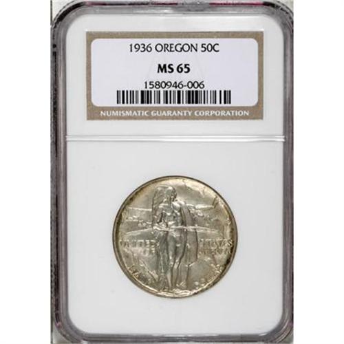 <B>1936 50C Oregon MS65 NGC.</B></I> NGC Census: (490/570). PCGS Population (770/599). Mintage: 10,006. Numismedia Wsl. Price for NGC/PCGS coin in MS65: $268. (#9345)<BR><BR><b>Shipping:</b> Coins & Currency (<a target="_blank" href="http://www.heritageauctions.com/common/shipping.php">view shipping information</a>\)