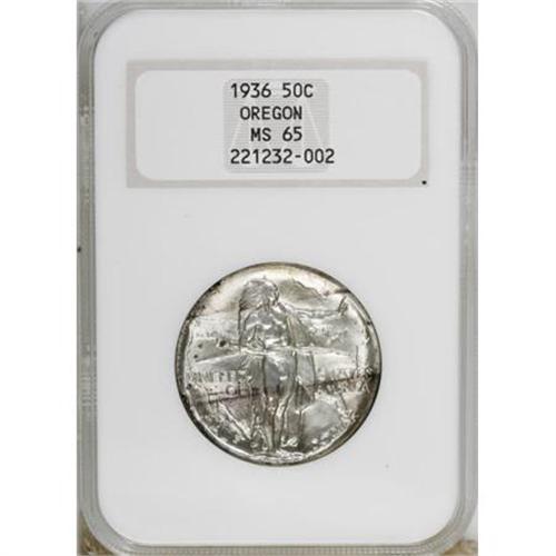 <B>1936 50C Oregon MS65 NGC.</B></I> NGC Census: (501/585). PCGS Population (780/606). Mintage: 10,006. Numismedia Wsl. Price for NGC/PCGS coin in MS65: $268. (#9345)<BR><BR><b>Shipping:</b> Coins & Currency (<a target="_blank" href="http://www.heritageauctions.com/common/shipping.php">view shipping information</a>)