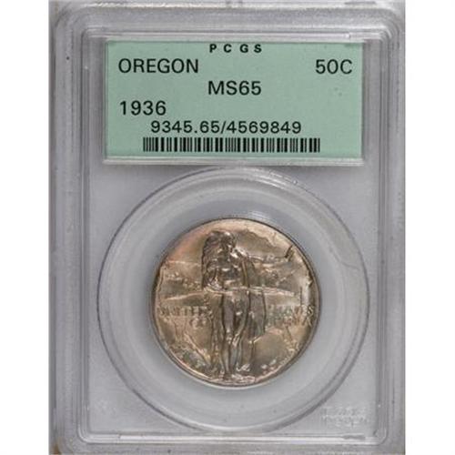 <B>1936 50C Oregon MS65 PCGS.</B></I> PCGS Population (776/604). NGC Census: (494/576). Mintage: 10,006. Numismedia Wsl. Price for NGC/PCGS coin in MS65: $268. (#9345)<BR><BR><b>Shipping:</b> Coins & Currency (<a target="_blank" href="http://www.heritageauctions.com/common/shipping.php">view shipping information</a>)