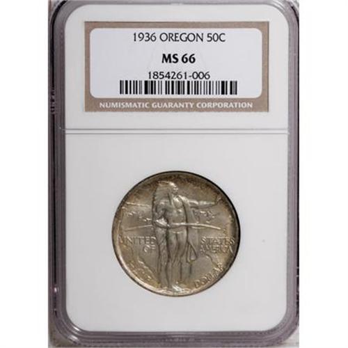 <B>1936 50C Oregon MS66 NGC.</B></I> NGC Census: (446/120). PCGS Population (462/132). Mintage: 10,006. Numismedia Wsl. Price for NGC/PCGS coin in MS66: $356. (#9345)<BR><I>From The Frank DuVall Collection of U.S. Commemoratives.</B></I><BR><BR><b>Shipping:</b> Coins & Currency (<a target="_blank" href="http://www.heritageauctions.com/common/shipping.php">view shipping information</a>\)