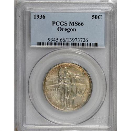 <B>1936 50C Oregon MS66 PCGS.</B></I> PCGS Population (471/136). NGC Census: (452/124). Mintage: 10,006. Numismedia Wsl. Price for NGC/PCGS coin in MS66: $356. (#9345)<BR><BR><b>Shipping:</b> Coins & Currency (<a target="_blank" href="http://www.heritageauctions.com/common/shipping.php">view shipping information</a>)