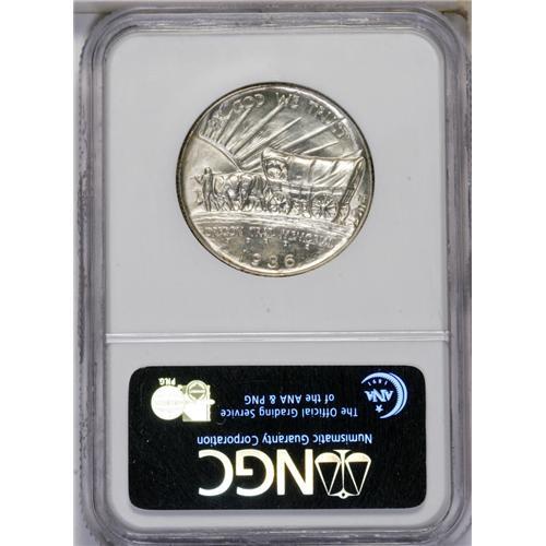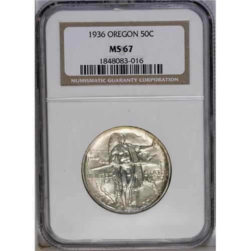 <B>1936<50C> Oregon MS67 NGC.</B></I> Lustrous, generally brilliant surfaces show a touch of cherry near the rim at 12 o'clock. Well struck with only the smallest of marks.<BR><I>Ex: Fred S. Guggenheimer Collection (Stack's, 1/53), lot 270.</B></I><BR><I>From The Redfjord Collection.</B></I>