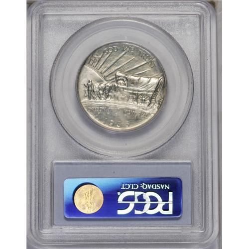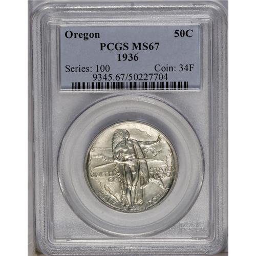 <B>1936<50C> Oregon MS67 PCGS.</B></I> A thin veneer of pale blue and rose-beige patina covers lustrous surfaces that are immaculately preserved. The design features are powerfully impressed, enhancing the eye appeal of this Superb Gem.